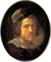 Bust length portrait with the artist turning slightly to look out at the viewer. He wears a hat and a white collar and dark coat. This work was acquired with assistance from the Wolfson Foundation.
