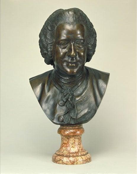 Portrait of Pierre-Louis-Marie Maloît (1730-1810), one of the 4 eminent doctors who sat to Pigalle. Doctor to Louis XV's daughters and accompanied them into exile at Rome. Wears 'the smile of reason' - so characteristic of portraiture during the Enlightenment. Bronze bust on marble soclet.