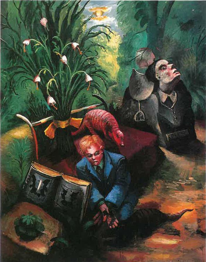 Steven Campbell’s Portrait of Rorschach Testing Himself and Finding Himself Guilty refers to Hermann Rorschach, the Swiss psychiatrist who created the famous inkblot test. A book showing the inkblot tests can been seen open in the foreground of this complex narrative picture.