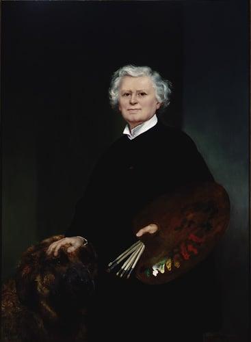 Portrait of Rosa Bonheur with a palette in her left hand. A dog is to the bottom left of the painting and the sitter strokes its head with her right hand.