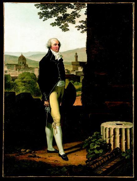 Full length portrait with Florence in the background. He stands slightly side on with his right foot out in front and holds gloves in his right hand.