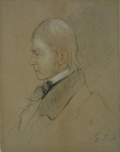 This bust portrait of Sir Walter Scott portrays the subject head bare, wearing a loose flowing tie and collar.