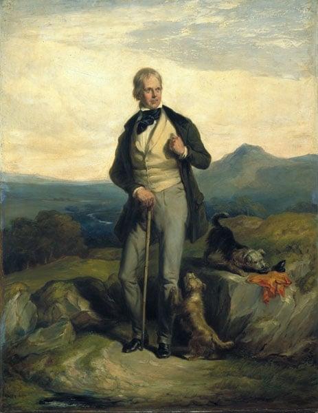 Cabinet portrait of Sir Walter Scott with his two Dandie Dinmonts, full length on a hilltop above the valley of the Tweed and the Eldon Hills. Signed: 'William Allan.........'.