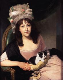 Half length portrait of a young girl in a pink dress seated in an armchair with a kitten in her lap. She has a black shall draped over her right shoulder and her left arm is gloved.