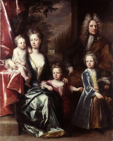 The portrait shows Edward Dryden, his wife Elizabeth Allen and their three children, John (later Sir John Dryden, 7th Bt.), Bevil and Mary. The family lived at Canon's Ashby from 1708.