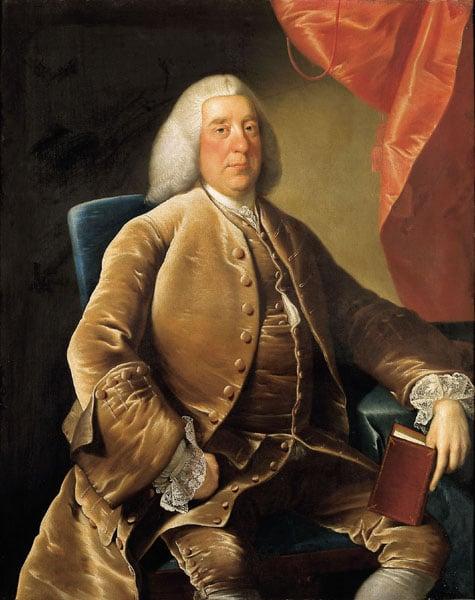 Seated and wearing a light brown velvet suit. Holds a book in his left hand and rests his right hand on his leg.