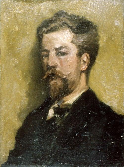 This is a portrait of a Scottish writer by a friend and follower of Whistler The sitter was one of the leading figures in the so-called Celtic Revival at the end of the 19th century, best known for his literary criticism, poetry and deep interest in art. Theodore Roussel came to England about 1874, and, apart from short periods abroad, remained here for the rest of his life. He met Whistler in 1885 and was profoundly influenced by him, Whistler observing that 'at last I have found a follower worthy of the Master'.