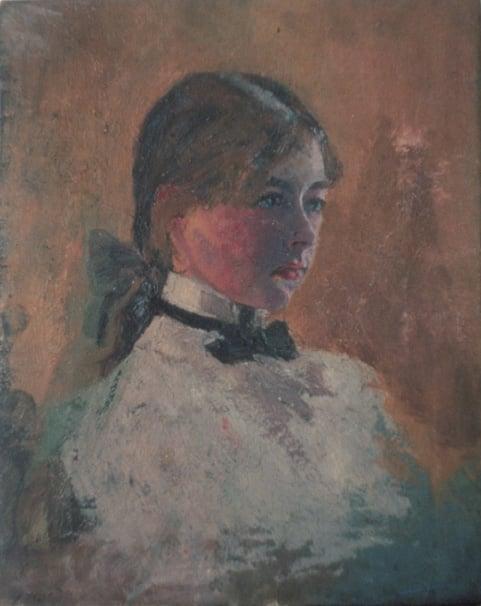 A head and shoulders portrait of Winifred John, who is shown wearing a high-necked white blouse with a black bow tie.