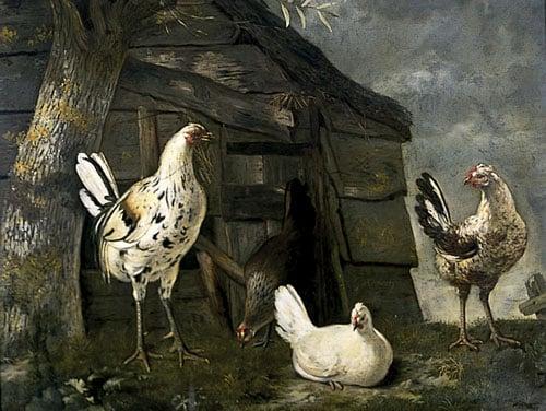 In this painting, four hens are depicted before a hut. One hen, in the foreground, is laying an egg. This painting was part of a collection of 117 works belonging to the industrialist and engineer F.D. Lycett Green and bequeathed to York through the Art Fund, in 1955, in recognition of the remarkable efforts made after the Second World War by its curator to transform it into a gallery of international importance.