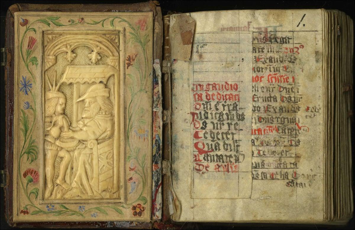 This precious prayer book gives rare insight into the life of a nun at the convent of Medingen, northern Germany, during the Middle Ages. At Medingen individual nuns are thought to have been responsible for the production of their own manuscripts, including the choice of hymns and meditations as well as the decoration and physical features of the book. This example includes a personalised calendar, Canticles, Creed, Litany and prayers, written in Latin with later additions in Low German. The manuscript is of 284 leaves written in a Gothic hand, with an early binding of stamped brown leather over wooden boards. Colourful ink drawings in the margins are literal illustrations of phrases in the illuminated text. The musical notation can be identified as the work of Margareta Hopes, who is mentioned as a young nun at the convent in 1505, and in 1524 as �cantrix�. The psalter, together with a medieval bone plaque once housed in its bindings, now joins two other manuscripts from Medingen in the Bodleian's remarkably rich medieval collections.