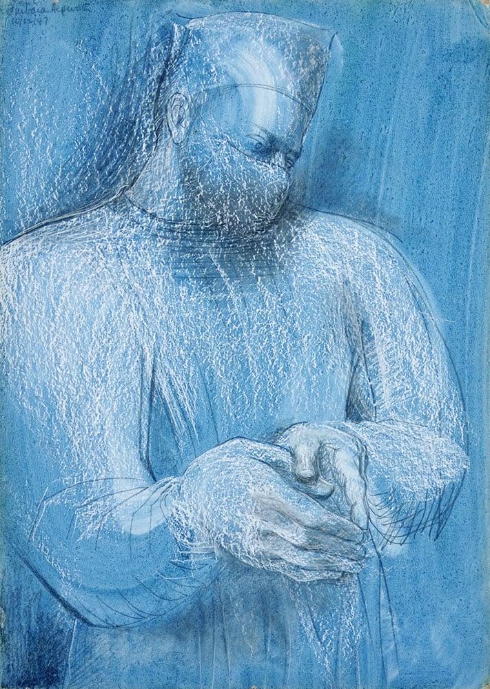 Depicted as a weighty and monumental figure, rendered anonymous by the medical mask, the surgeon contemplates the impending operation, his hands meeting as he mentally prepares them for action.