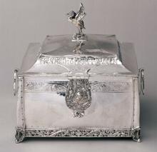 Highly polished square box with decorative floral edging, small leafshaped feet and decorative latch. Topped by a small figure of a bird with wings spread. Engraved with date and details of presentation on lid.