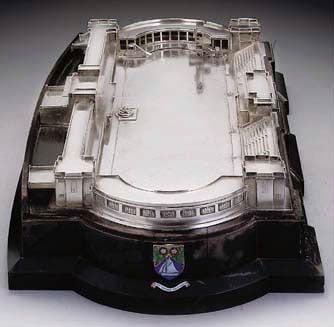 This is an accurate scale model of the historic Morecambe Open-Air Bathing Pool, later called 'The Super Swimming Stadium' which opened in 1936 and was demolished in the 1970s. The pool was uncompromisingly modern, exploiting the new possibilities offered by reinforced concrete. It is a reflection of the national importance of the building that Goldsmiths & Silversmiths, London, one of the leading goldsmiths of its period was commissioned to make this presentation piece.