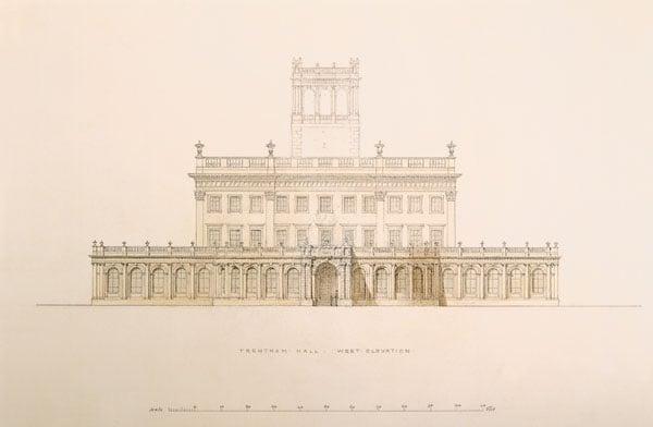 Trentham Hall, built between 1834 and 1848, was the first country house constructed in Barry's Italianate style, a style which went on to make his name and fortune. This volume contains three elevations and four architectural plans drawn by hand. Trentham Hall was demolished in 1911.