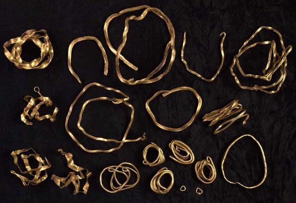 The hoard consists of 17 objects including 4 torcs, 2 penannular bracelets, 3 ribbon bracelets, 5 round bar bracelets, two D-shaped penannular bars and one ribbon torc with hooked terminals. This is only the second gold hoard found in Somerset.