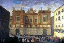 The palazzo dominates the picture, lavishly adorned with decorations including heraldic shields of of England, the Pope and Rome. A street crowd in foreground, lines of soldiers with Prince James speaking to a Cardinal with his sons behind.