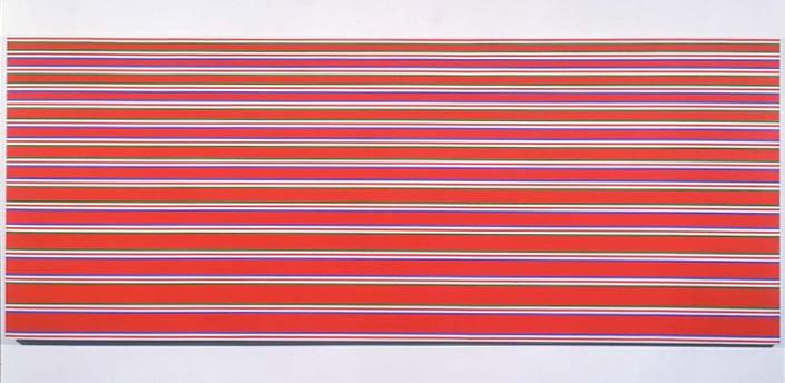 One of a series of paintings in which Riley explores the optical relationships set up by the combination of the colours red, blue and green. The title with its Indian associations refers to her impression of the strong flat colours- particularly reds, often with whites, yellows, blues and greens, used in some schools of Indian miniature painting.