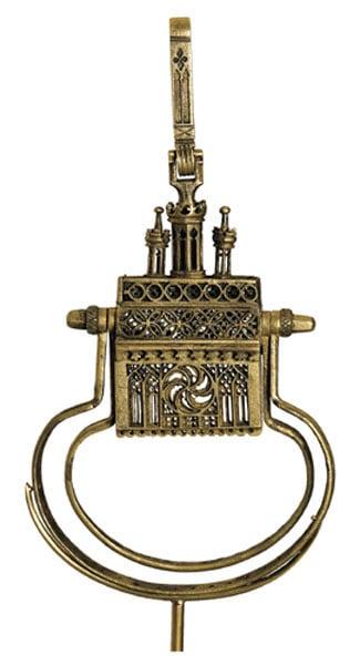 Central bar from which 2 loops hang, the inner of which is pierced with holes for the attachment of fabric. The central bar has pierced decorative panels and has three towers attached.