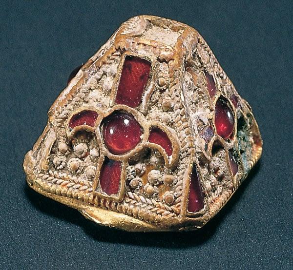 4 sided pyramidal form with beaded filigree disguising the joins. Each side decorated with matching design of 5 garnets. Each corner contains a teardrop garnet. The stones are of exceptional quality.