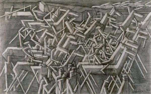 This drawing from Bomberg's Vorticist period is stylistically linked to the Futurist movement in mainland Europe, which reduced imagery in a work to geometric shapes and transformed organic life into machine-like forms. This probably depicts the moment before a race begins with the horses and jockeys reduced to tubular forms.