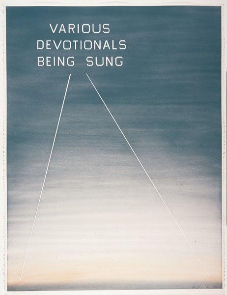 Ed Ruscha's work has been associated equally with American Pop Art and with Conceptual Art. His use of words and typography links him with both these movements, but his sensibility is much closer to that of the poet, using words to conjure up a complex of images and associations. It is a sensibility honed by his training in commercial graphic art and by his life in Los Angeles, city of the film industry, of ubiquitous advertising hoardings and of the freeway. The three drawings in question are fine examples of Ruscha's ability to make pictorial and internalized images out of words floating in largely monochrome fields of colour.