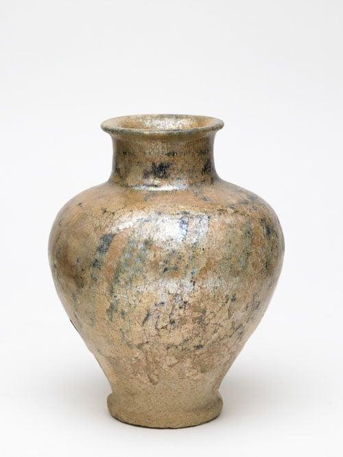 Vase of buff pottery, a loose sandy texture. Neshky characters in high relief.