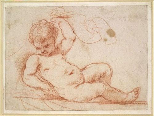 A reclining putto, looking down to left, study for a frieze. He leans to the left, supporting himself on his right elbow; he looks downwards towards the left, while his left arm is raised to support what appears to be a drapery, the end of which billows out in front of him. Part of an album of drawings belonging to Lord James Cavendish MP (d 1741), son of the second Duke of Devonshire (1665-1729), founder of the great collection of drawings at Chatsworth. The collection of drawings form an interesting relic of the great age of collecting in England.