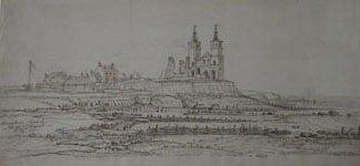 The Roman Fort at Reculver was built in the latter half of the 3rd century. After it was abandoned, a Saxon Church was built within its walls incorporating Roman building materials. It has been said of Ward's drawing that 'he was not always a very easy, or even correct, draughtsman but he was an extremely observant one whose work is often forceful and full of rugged character'. This Church was originally built 9 miles from the sea, but is now right on the coast.
