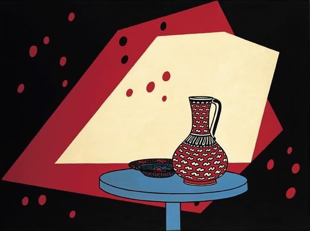 In the centre is a red jug and blue bowl with islamic designs sit on a blue table. Behind these are two large abstracts shapes. The white shape is in front of the red on a black background with small red and black circles