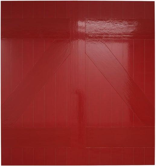 Red Barn Door comprises two aluminium panels painted in red household gloss paint. Areas of the surfaced are raised, shapes created by Hume’s use of silicone paste to recreate the ‘Z’-shape wooden framework seen on the barn doors of his upstate New York studio, where he spends his summers. Hume creates works based on his own environment, and his American studio has informed many of his works. His large gloss-paint canvases of hospital swing doors turned utilitarian objects into abstract paintings, ice-cream coloured panels punctuated by circles and rectangles. Despite Hume’s position as one of Britain’s leading painters, Tate has only four of his paintings in its collection, and this acquisition marks a continued effort to represent his work in more depth.