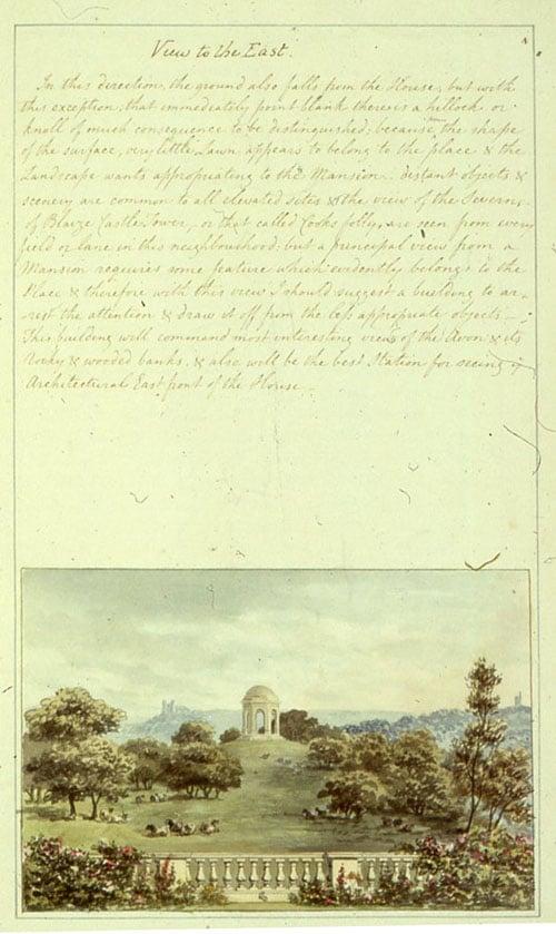 9 pages of manuscript including drawings and a plan. Proposed designs for the siting of Abbots Leigh and the landscaping of the grounds with a view to giving the estate an individual charater and the views from the house 'congruity'. Bound in red morocco by Sangorski and Sutcliffe, folio (41 x 26cm).