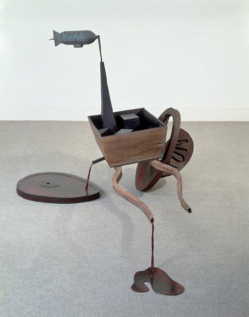 In 1988 Woodrow was invited to exhibit in the ground floor galleries of the Imperial War Museum. By December 1989 he had completed six sculptures all cast in bronze from cut and shaped maquettes. Refugee is one of the most sombre of the six sculptures and one which relates to the Museum's wider role as an archive of social history and wartime experience. It is about the impact of war on civilian populations. Inside the cart Woodrow has created a symbolic world with blocks representing the homes that have been abandoned but which are carried in the memories of those who have been forced to flee. The cart is a wreck, just another piece of detritus washed up by the tide of war, its wheels broken, its lifeblood pouring away, symbolising the expenditure of human life on wars that are now fought not on distant battlefields, but through the streets of cities the world over.