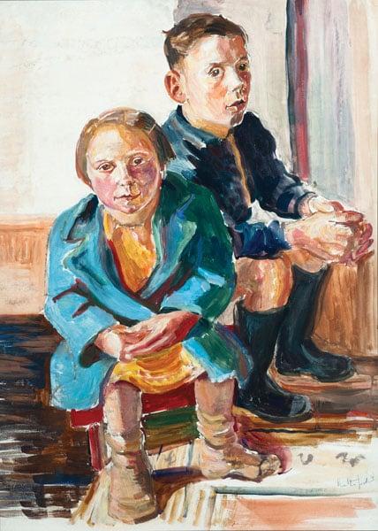 Rutherford was born in Chelmsford and became an official war artist during the Second World War recording her work as part of the Red Cross Voluntary Aid Detachment. She performed a variety of jobs: driving a mobile canteen round gun batteries on the east coast and working as a nurse in hospitals and convalescent homes for servicemen. 'It was an exhausting struggle trying to be a good artist and a good nurse', she remembered. 'In the end , I gave up being a good nurse'. This work depicts two evacuee children and was recently discovered in folios unopened since end of World War Two.