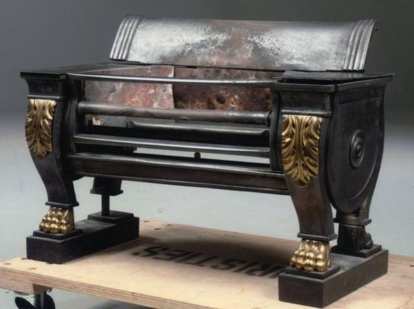 A Regency ormolu mounted cast iron fire grate, with scrolling square tapering pilaster supports with acanthus headings and paw feet on a plinth base. The firegrate was supplied to Matthew Boulton's son Matthew Robinson Boulton to furnish his home at Tew Park, Great Tew, Oxfordshire. There are other examples of Bullock's work in the Birmingham collection, including designs on paper and fine furniture but this is the firegrate. This work was acquired with the support of the Art Fund with the assistance of the Esmée Fairbairn Foundation.