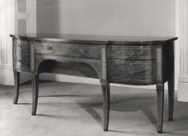 Sideboard with sabre legs, inlaid with holly stringing, and key pattern inlay on edge of top.