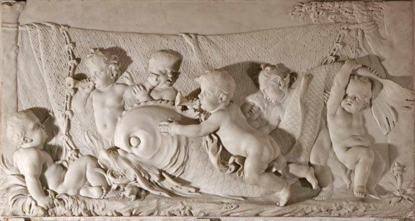 This relief of putti playing with a dolphin represents an allegory of water. It is typical of a genre of carving that the Flemish sculptor Michael Rysbrack introduced into England, where he was working from about 1720. The work shows a contrast between high and low relief and between soft and crisply detailed surfaces. The depiction of plants is typical, as is the technique of hatching the foreground terrain. The design is almost certainly Rysbrack's own and the relief is carved out of a single panel of white marble. His method was to work in terracotta, make scale revisions and finally carve in marble.