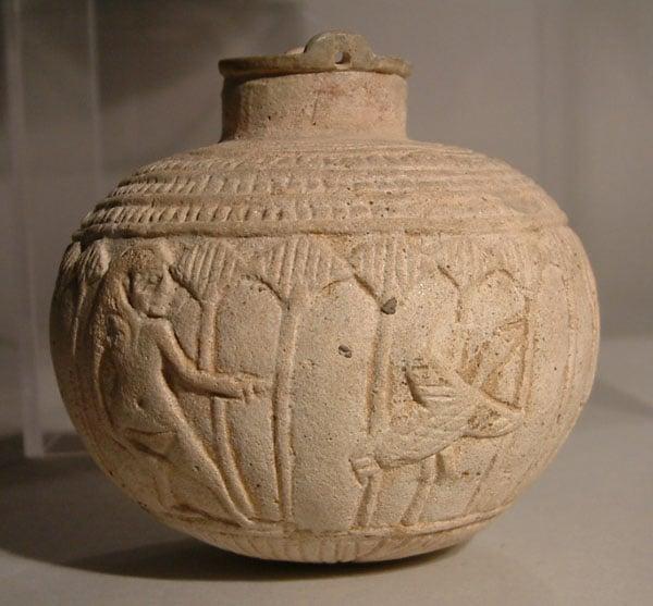This work is a globular vessel made of faience, the quintessentially Egyptian glazed material, decorated with scenes of pygmies hunting ducks in the marshes. This depiction of the Nile landscape evokes the primeval waters from which life first emerged in Egyptian mythology, and the cheerful pygmies hunting ducks echo the constant struggle the gods and pharaohs must wage against the forces of chaos. Bolton MuseumÂ’s Egyptian collection is one of the most comprehensive in Britain, formed as a result of over 120 yearsÂ’ support of British excavations in Egypt.