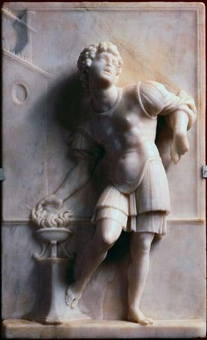 The relief is thought to be part of a group of tablets which represent human virtues. The subject is taken from Livy 2: 12-13. Caius Mucius, a young Roman noble, penetrated the Etruscan camp in 507BC but instead of assassinating the King of the Etruscans, he killed the King's aide by mistake. To show the guards how cheaply he valued his life he thrust his right hand into the flames. The King was impressed and let him go. Scaevola means left-handed.