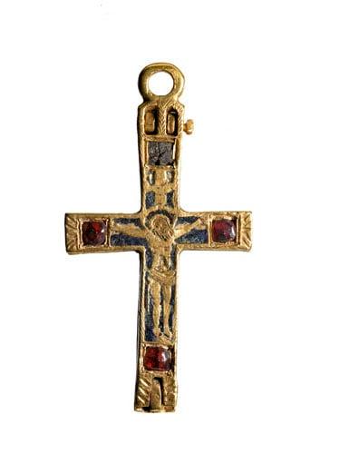 The front is engraved with an image of Christ on the Cross, reserved on a background of dark blue champleve enamel. At the end of each arm of the cross is a square setting; three of which are set with uncut garnets.