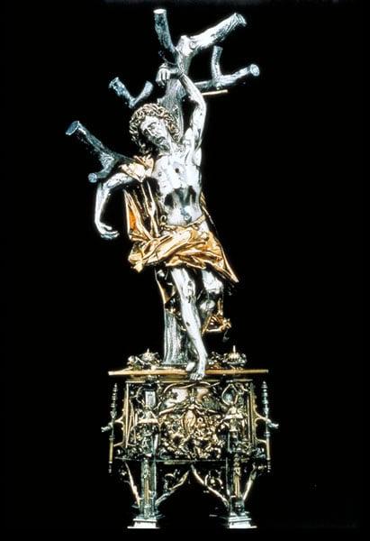 This reliquary was destined for America, when its export licence was temporarily deferred to give the museum time to raise the money for its purchase. It depicts St. Sebastian lashed to bare tree with his right arm bent at side, and his left arm raised. The relics are contained in a glazed panel. According to a Latin inscription on the base, it was commissioned by a monastery near Augsburg during a time when the monastery was suffering from plague. The Roman soldier, St Sebastian was frequently invoked as a protector against the plague.