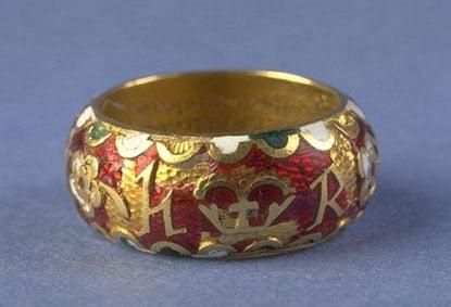 Ring presented to Richard Warde by Henry Viii. inner hoop engraved with dedication & coat of arms. Enamelled, with a chain of Tudor roses linked by leaves interupted by a crown & the letters H.R.