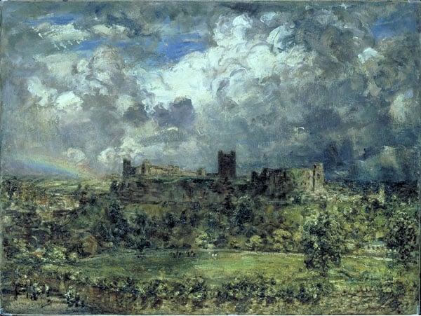 In the centre: the castle on a wooded hill; foreground: a field with horsemen; in the distance: a rainbow with sunshine on the hills. One of nineteen gifts to fifteen museums by Sir Michael Sadler through the Art Fund between 1921 and 1942.