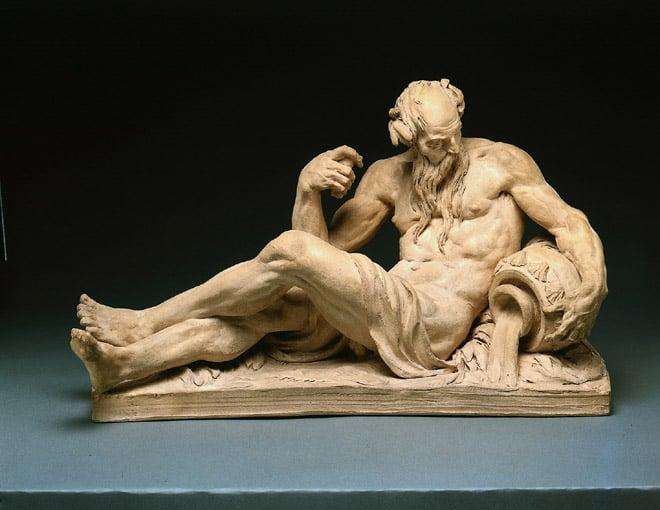 This sculpture is a demonstration of supreme virtuosity in 'thinking in terracotta', the method he had inherited from Jean-Baptiste Lemoyne. It is a seriously classical subject, and although its brilliant naturalism and compressed energy hark back to baroque models, Caffieri's terracotta is a contained, closed composition in contrast to the loose expansiveness of Lemoyne's Oceanus. The vase, from which the river water flows, with its neat frieze of shells, is a crisp piece of neo-classical design. Caffieri seems simultaneously to be declaring himself a virtuoso in the French terracotta tradition he had inherited, and asserting his mastery of the new neo-classical mode, of which the Academie de France in Rome had been the seedbed.