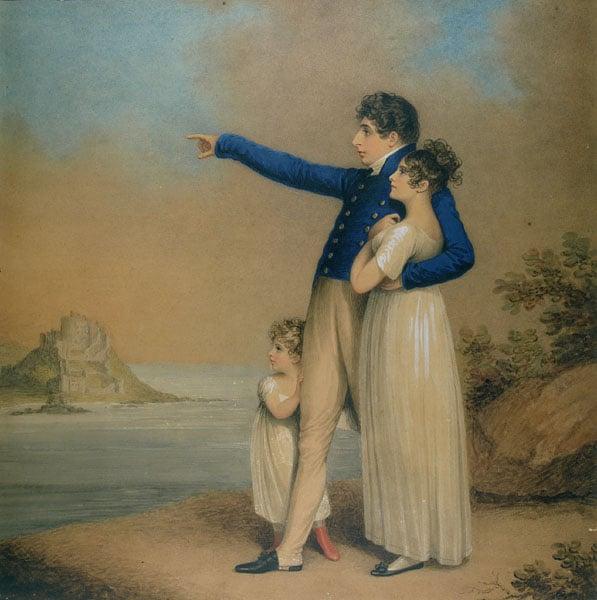 Robert Southey, Poet Laureate, stands gesturing out to sea. He embraces on his three younger daughters and his youngest son and future biographer Cuthbert Charles stands at his knee. The castle which rises dramatically in the background may tentatively be identified as St. Michael's Mount.