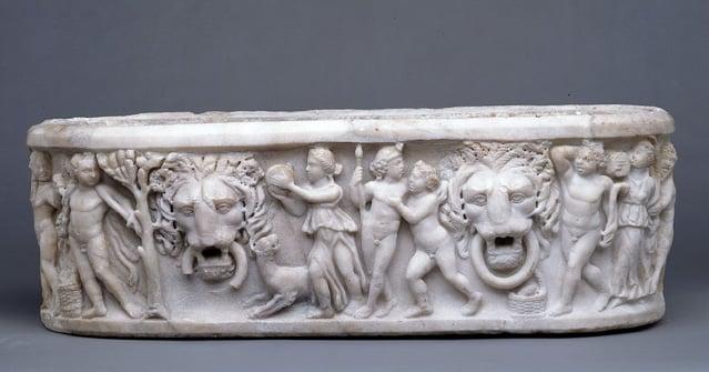 Sarcophagus of a child, carved in relief with scenes celebrating Bacchus, who appears in the centre of the front panel. The figure on the lid, a sleeping Paposilenus, is a Neo-Classical addition. Lid of the chest is 35.6 x 11.2 cm.