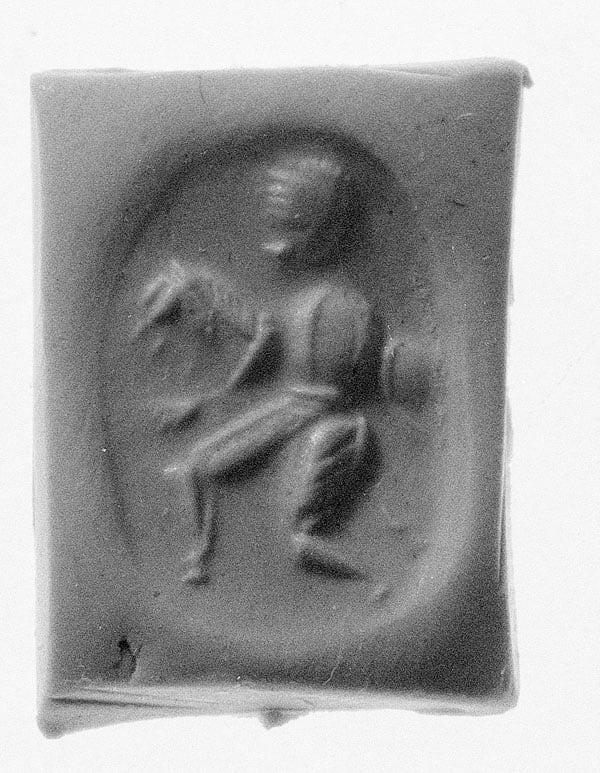 Portrait-relief gem of woman in profile to right. Hair in ribbon under 2 rows of curls, plaited at back and tied in loop at nape of neck. Closely resembles Sainte-Chapelle cameo identified as Agrippina, wife of Germanicus and mother of Caligula. Subsequently discovered to be a forgery.