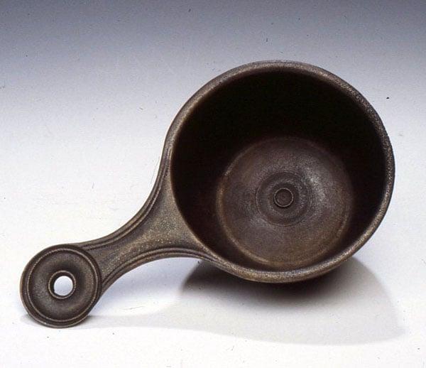 The base of this Roman trulla or saucepan has four concentric rings and the handle, bordered by a cable-moulding, terminates in a circular expansion with raised cable moulding around a central perforation. The handle of the trulla bears three inscriptions recording the names of the bronzesmith (albeit abbreviated), of the cohort, of the centurion, and of the individual owner.