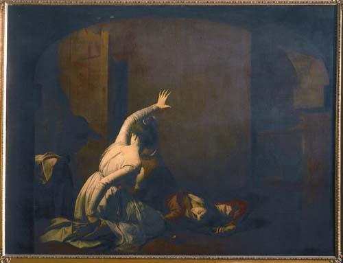 The moment when Juliet awakes in the tomb to find Romeo's dead body and the empty cup of poison beside it. Seizing the dagger, she is about to kill herself.