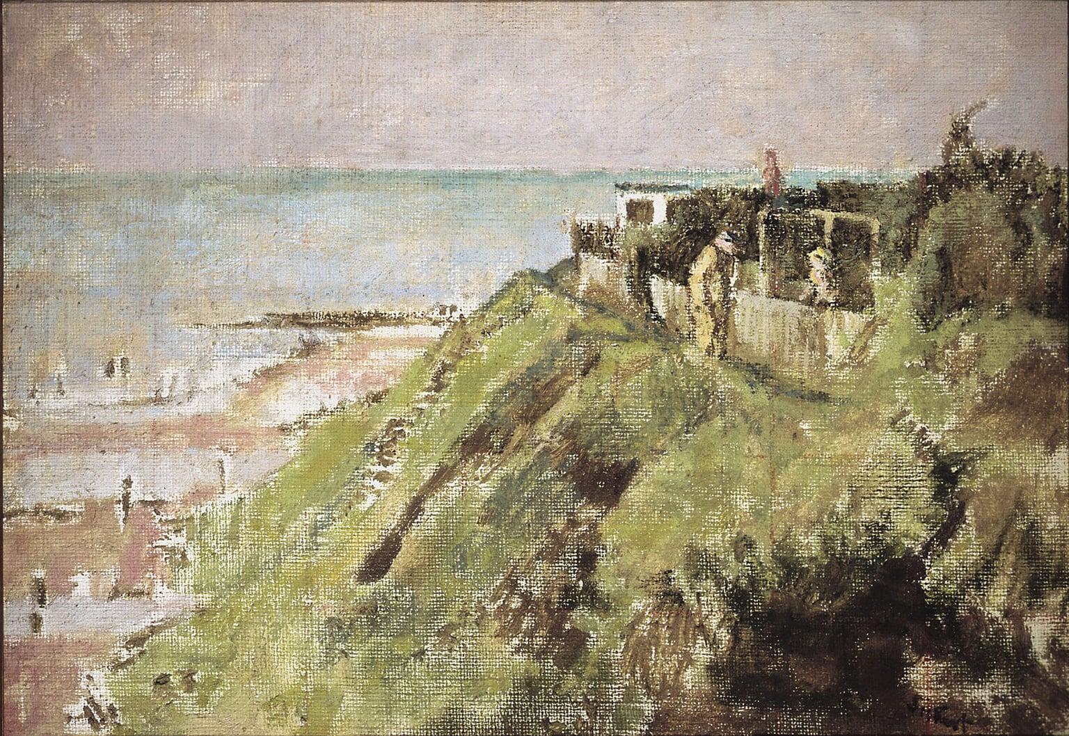 House on a hilltop to the right with two figures talking. The sea is behind.