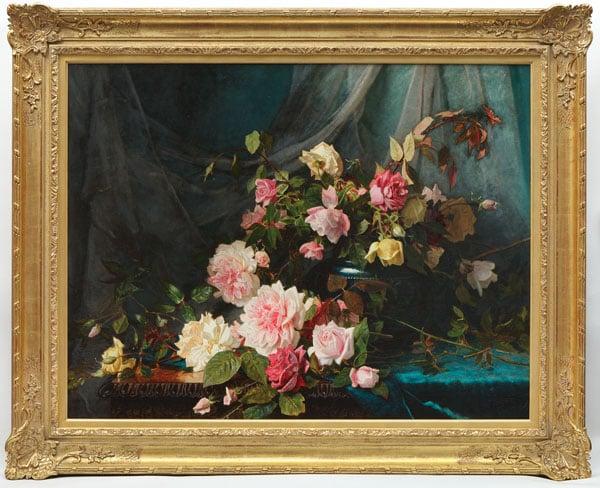 The first Falmouth Art Gallery was opened in 1894 and featured work by Hemy, Tuke, Sargent, Whistler, Leighton, Forbes and the Knights among others. The Falmouth Packet reported: ‘First among the pictures comes a large and beautifully arranged group of roses by the veteran painter Sophie Anderson, whose famous picture The Choristers has been known and appreciated in every land. Daring and rich in colour and design the hangers Messrs C.Napier Hemy and W.Ayerst Ingram have given it the post of honour in the line as number one.’ This work is believed to be the same piece that was exhibited at the opening of the first gallery. Although she had an international standing and influence and was a major figure in the artists’ colony at Capri, the Artist has today largely been forgotten. Presented to Falmouth Art Gallery by the Art Fund to celebrate the life and contribution to Falmouth Art Gallery of Brian Stewart